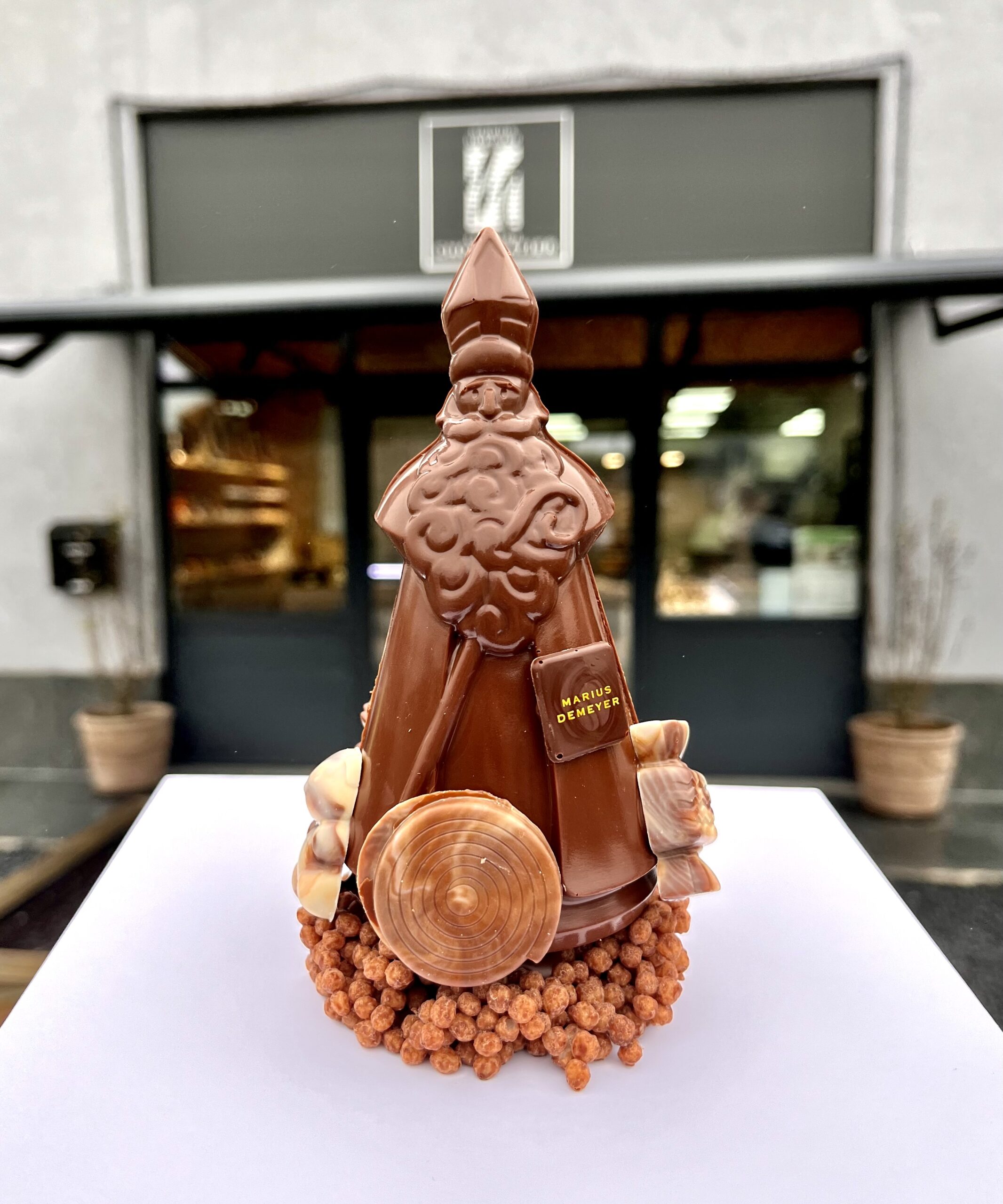 Saint Nicolas moulé en chocolat au lait du Pérou 39% et assortiment de petit caraques chocolat noir, lait et blanc sur base de riz soufflé.